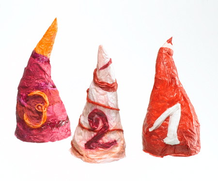 24 Hütchen im Karton / aufgestellt auf dekorativem Grund / 50 x 30 cm